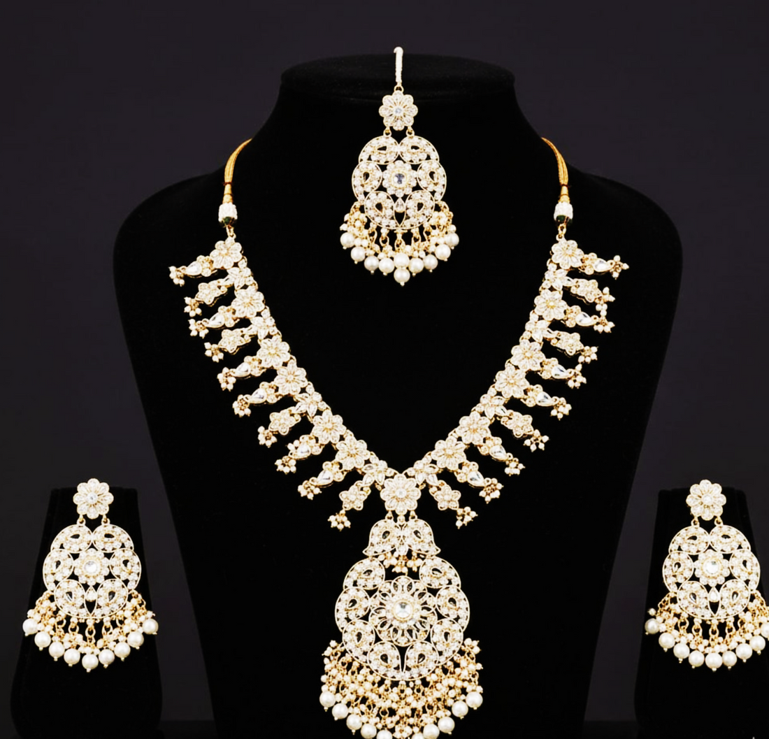 The Aishwarya Bridal Set showcases timeless craftsmanship with intricate stone work in classic white, enhanced...