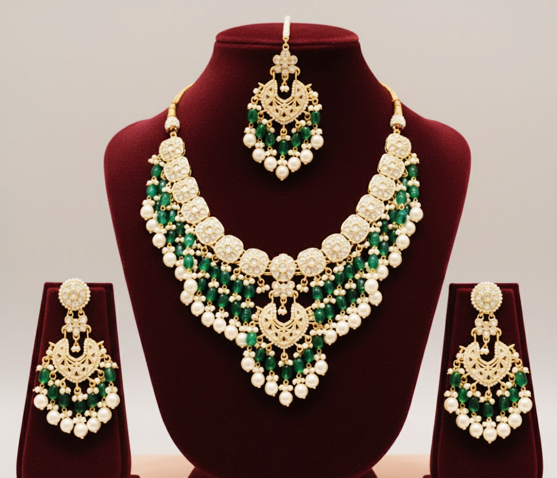 The Aashni Bridal Necklace Set showcases exquisite craftsmanship with sparkling stone motifs, rich green bead...