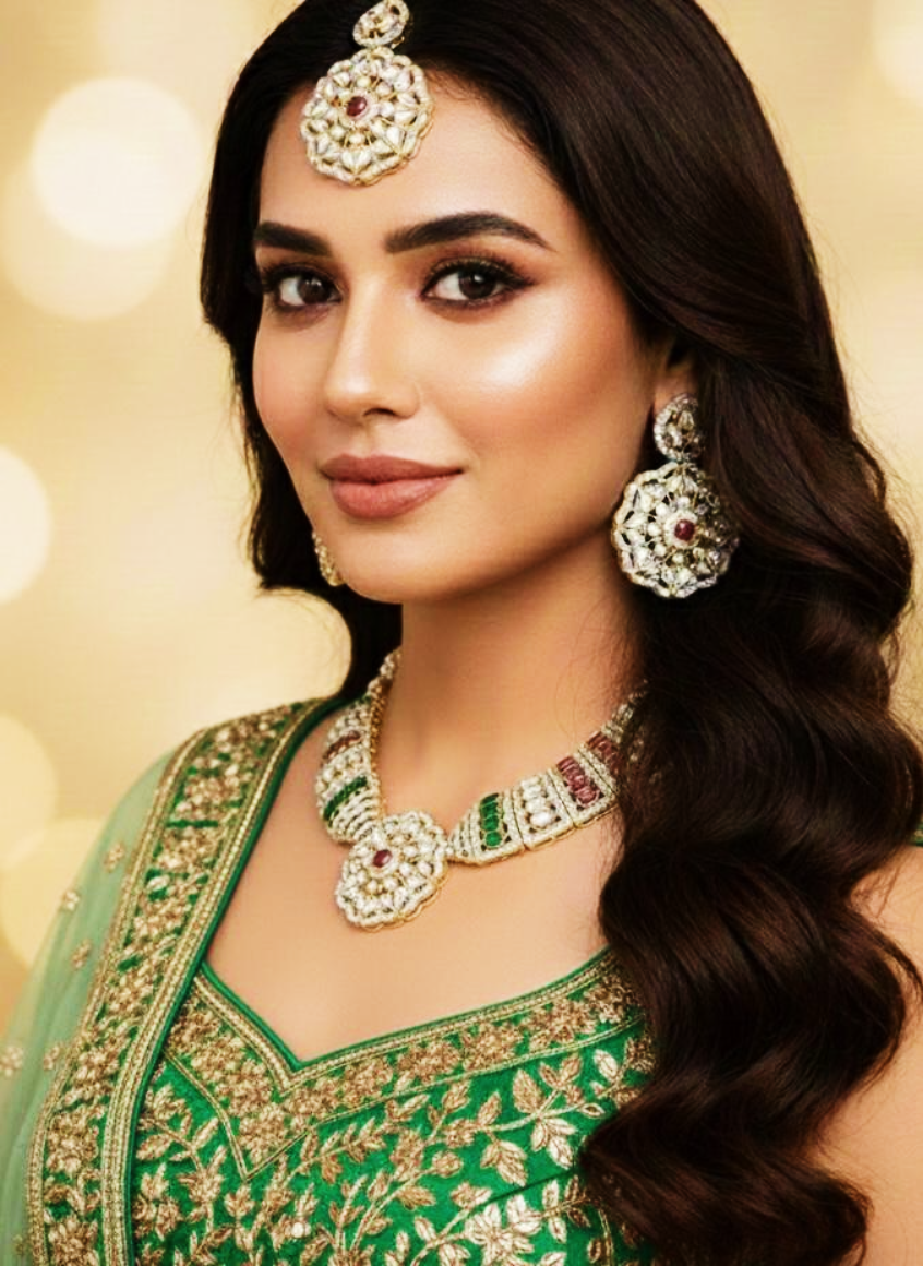 Step into royal elegance with the Aradhya Kundan Bridal Necklace Set, a timeless masterpiece inspired...