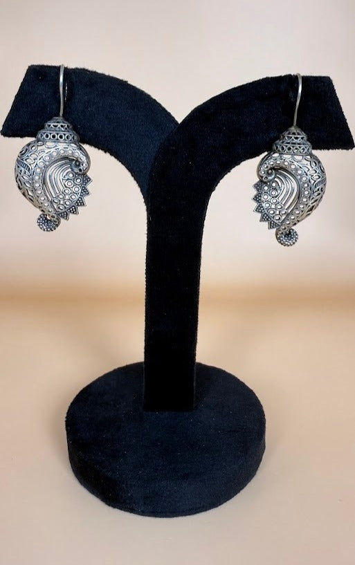 Elevate your ethnic look with these stunning Peacock Jhumka earrings crafted in oxidised silver finish....
