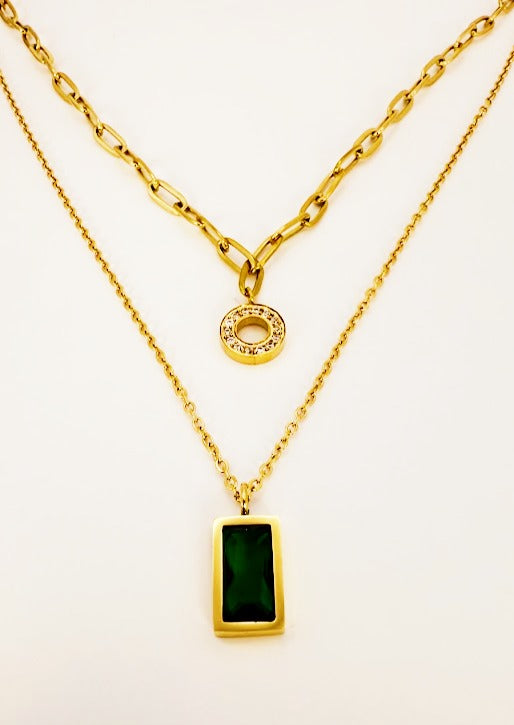 This is a stunning and sophisticated two-tiered layered necklace with a striking emerald and gold...