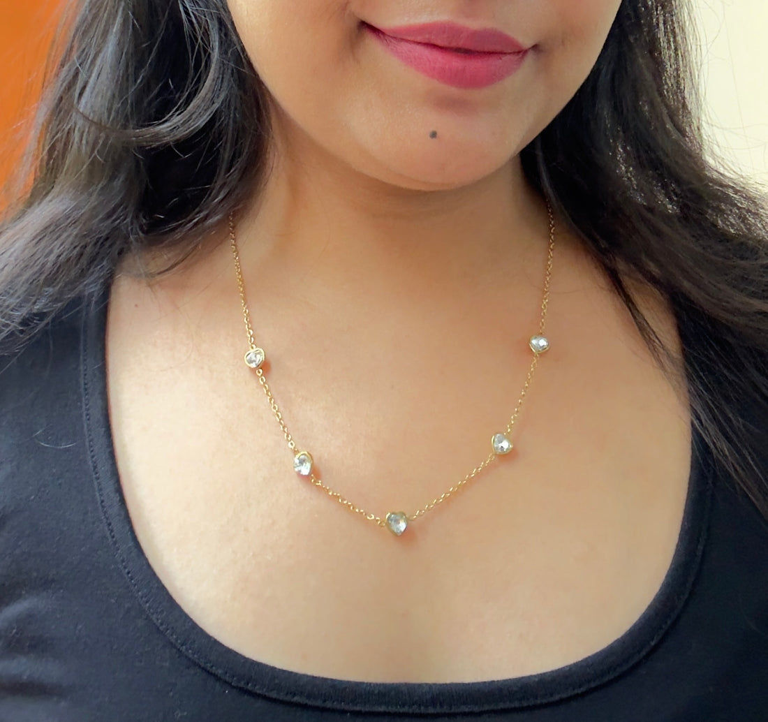 This is a delicate and graceful necklace that features a series of small, heart-shaped charms...