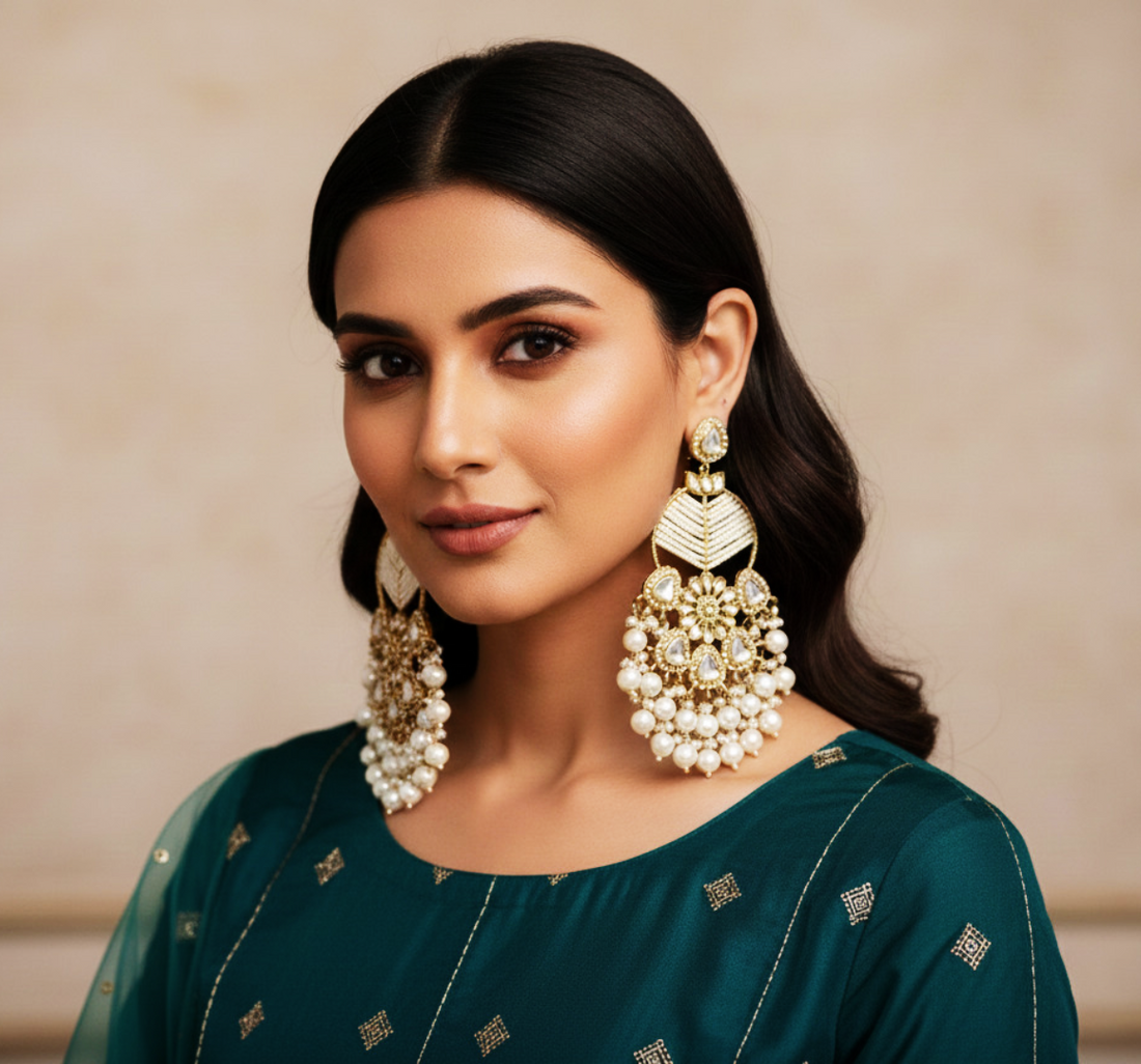 Elevate your festive look with our Tanira Kundan Pearl Earrings, crafted with intricate kundan work,...
