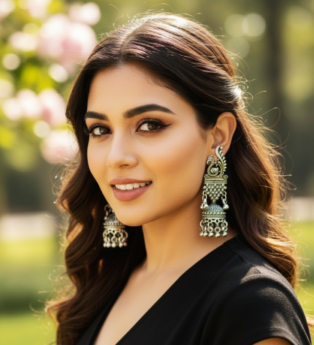 Elevate your ethnic look with these stunning Peacock Jhumka earrings crafted in oxidised silver finish....