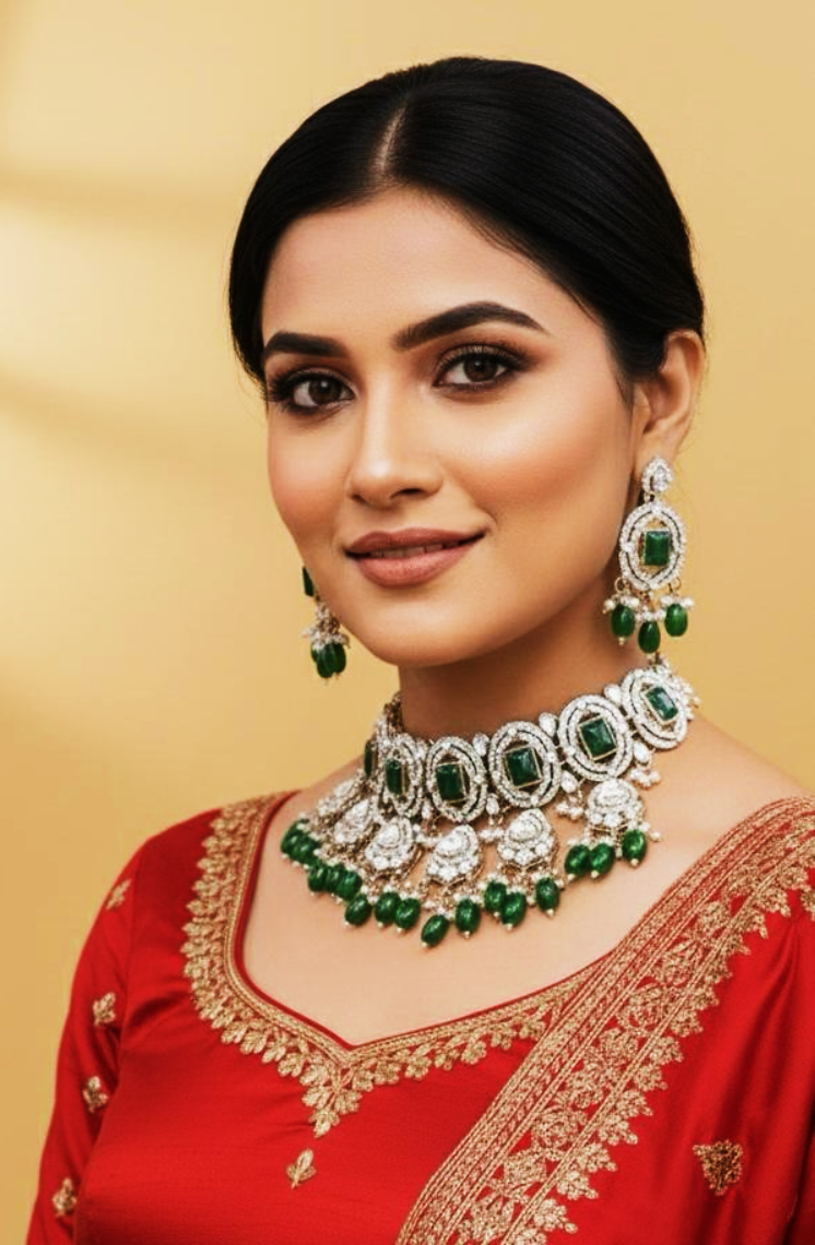 This stunning Jiaana Green Moissanite Necklace Set is a regal, traditional Indian jewelry set designed...