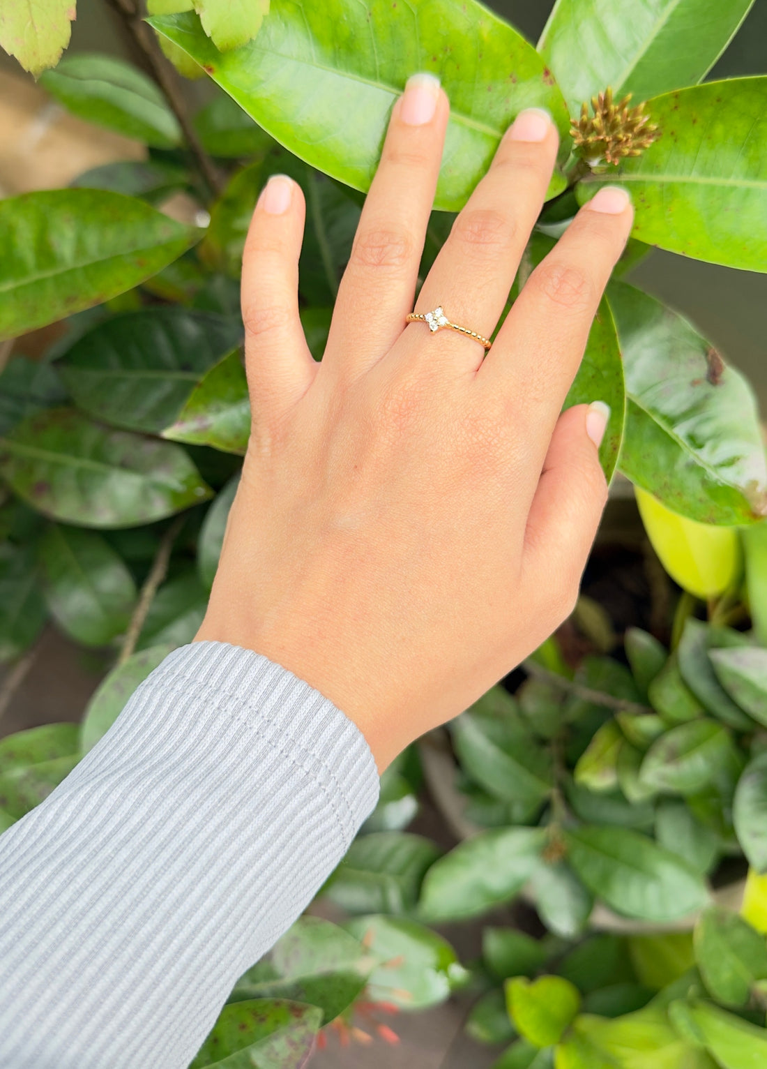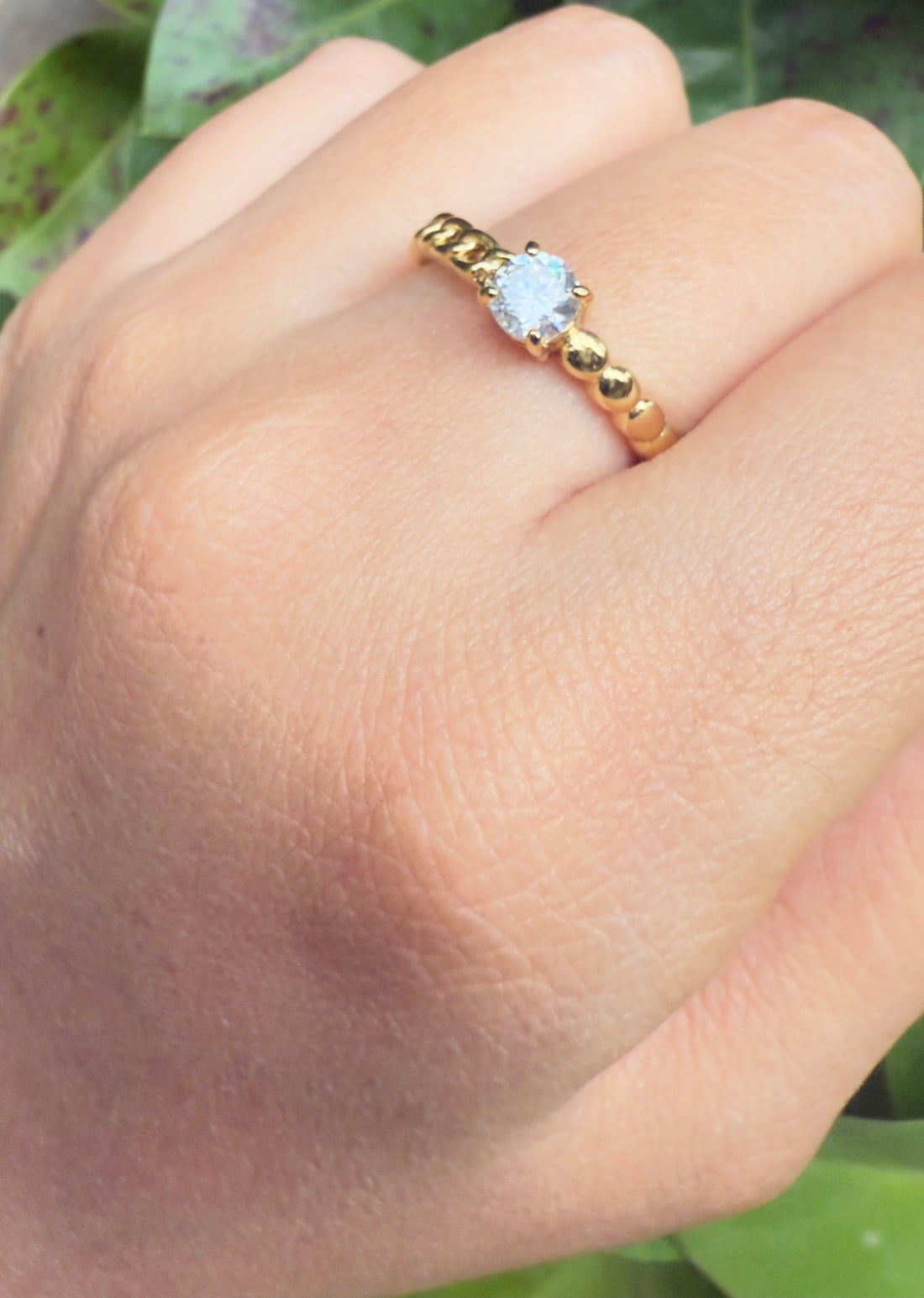 The ring's centerpiece is a small, brilliant, round-cut clear stone, which is a classic solitaire....
