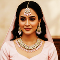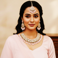 Embrace timeless elegance with the Aaravi Kundan Bridal Set, beautifully crafted for brides who love subtle luxury. Adorned with luminous kundan stones and delicate light pink bead detailing, this set radiates grace, femininity, and royal charm. The intricate motifs paired with pastel hues create a refined bridal look that is both traditional and effortlessly elegant.