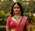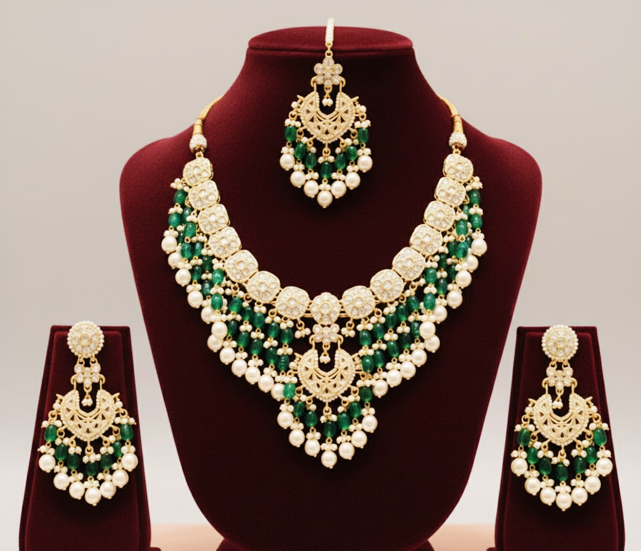 The Aashni Bridal Necklace Set showcases exquisite craftsmanship with sparkling stone motifs, rich green bead detailing, and elegant pearl drops. Designed to enhance traditional bridal looks, the statement necklace is paired with matching earrings and a coordinated maang tikka for a complete, regal appearance.