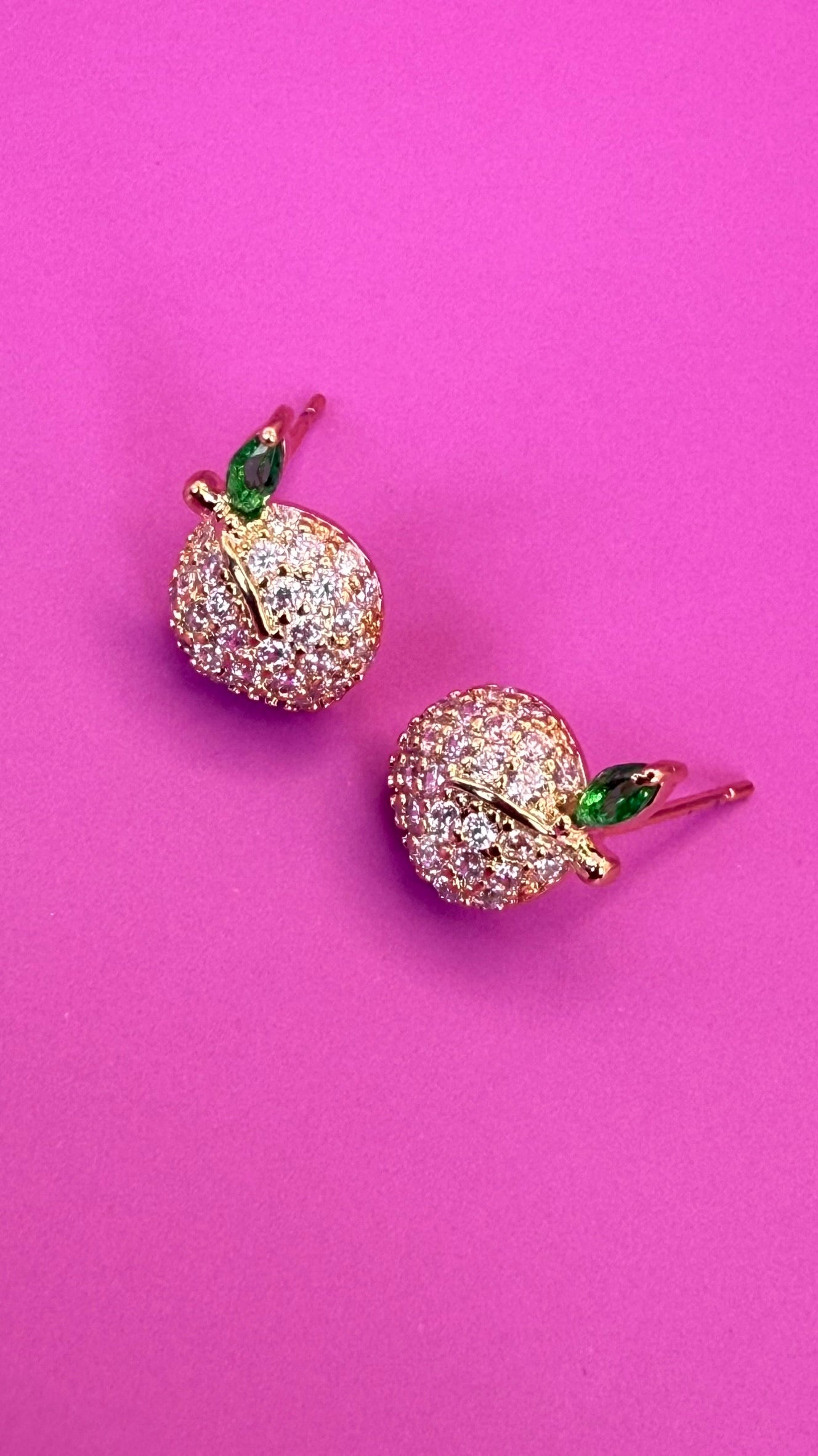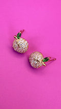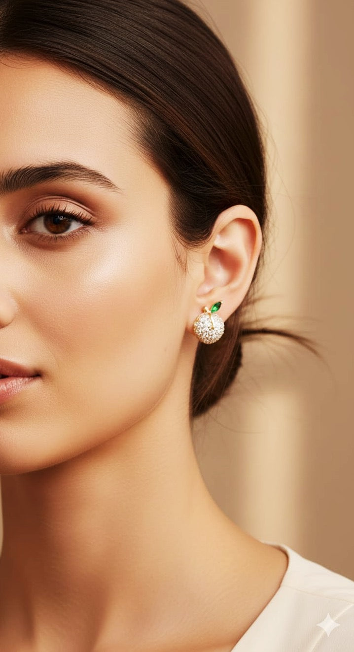 These earrings are a charming and whimsical accessory that brings a touch of fairytale magic to your style. Designed to resemble a tiny, sparkling fruit, they feature a brilliant surface of glittering stones and a delicate green leaf accent, all set in a lustrous golden tone. Key Features: Fruit-Shaped Design: The main body of the earring is a small, three-dimensional sphere, perfectly sculpted to look like a miniature fruit, such as an apple or a berry.