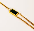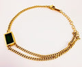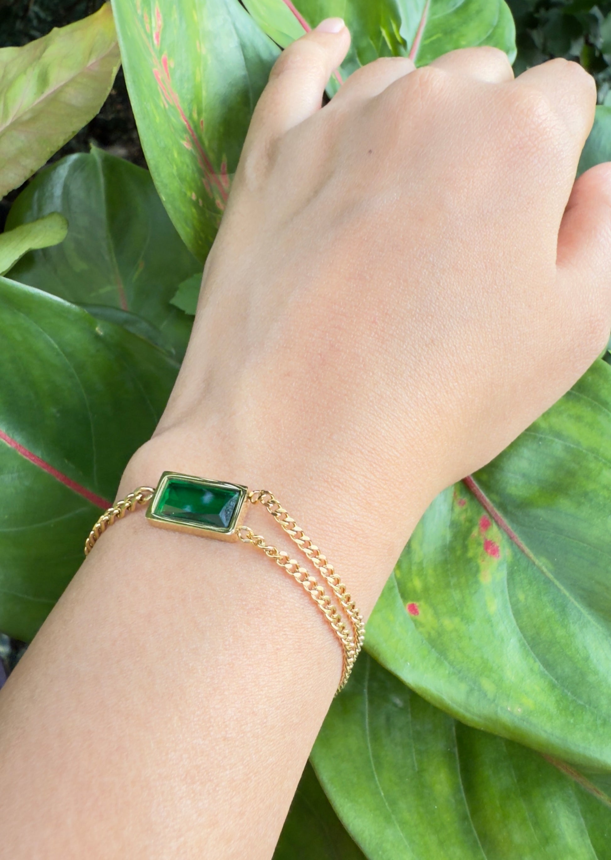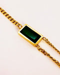 This bracelet is a sleek and sophisticated accessory that combines classic design with a bold pop of color. It features a striking, emerald-green gemstone as its centerpiece, which is beautifully framed by a polished, golden-toned double-strand chain.