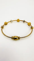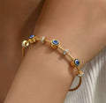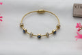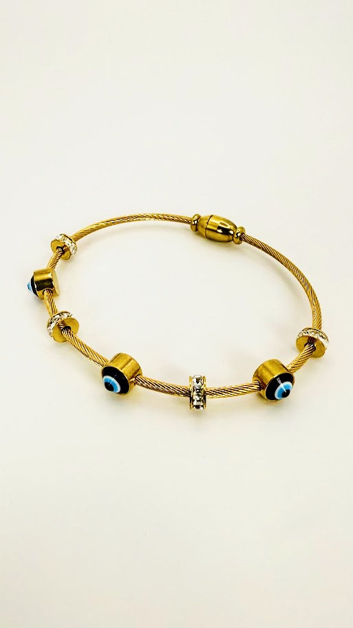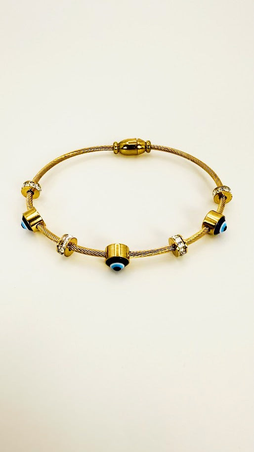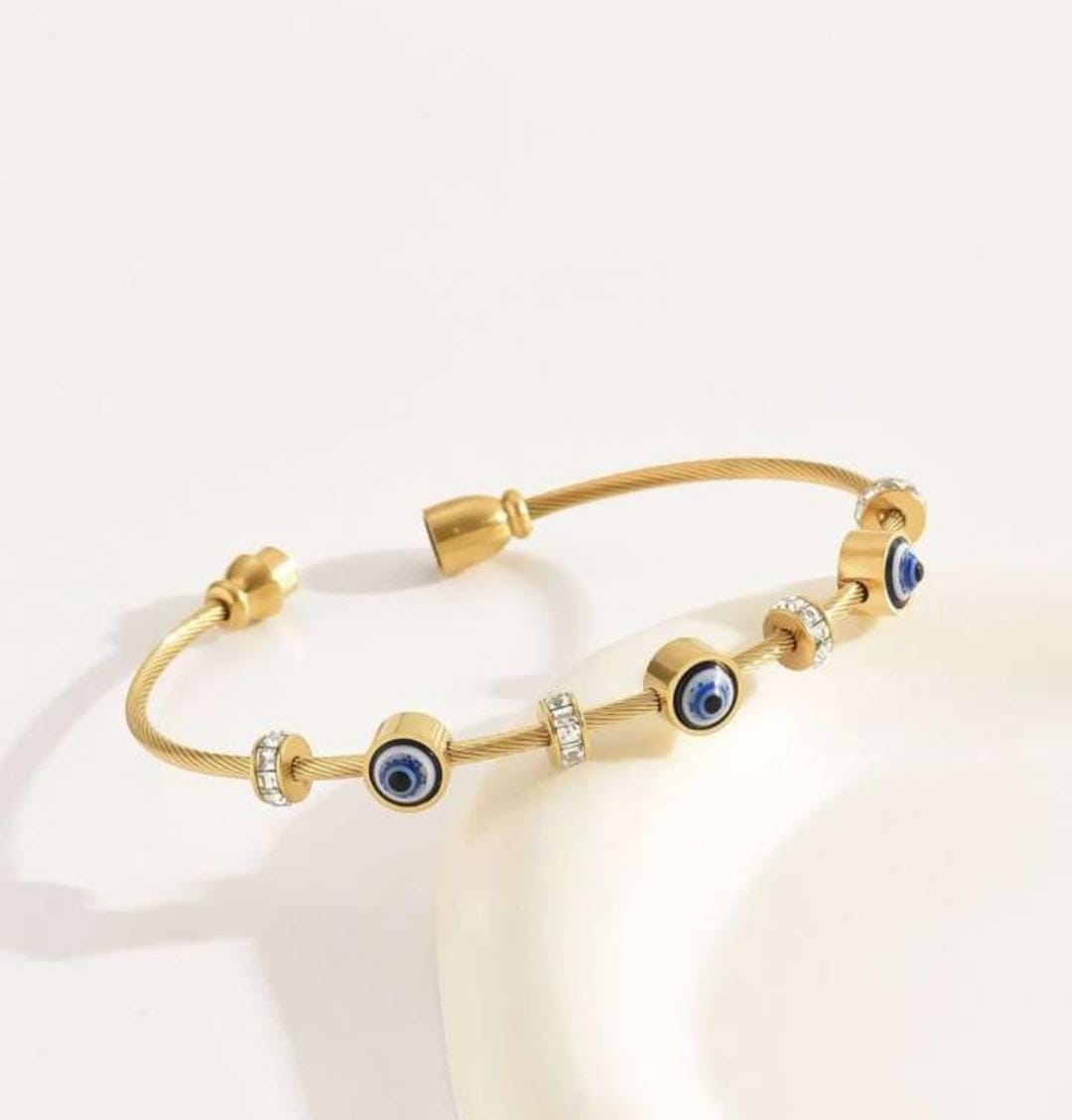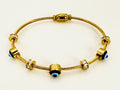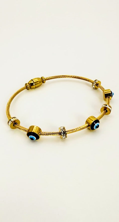 This is a modern take on a traditional bangle, also known as a "kada" in South Asian culture. The design features a stiff, cylindrical or cable-like golden wire that forms the main structure of the bracelet. Along this wire, several individual charms are threaded. Motif Details: The central focus of the bracelet is the "evil eye" motif. These charms are typically round, with a concentric circle design of blue, white, and a darker central pupil, all set within a golden frame. The evil eye is a well-known ancient talisman believed to ward off negative energy and offer protection to the wearer.