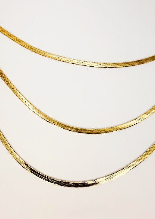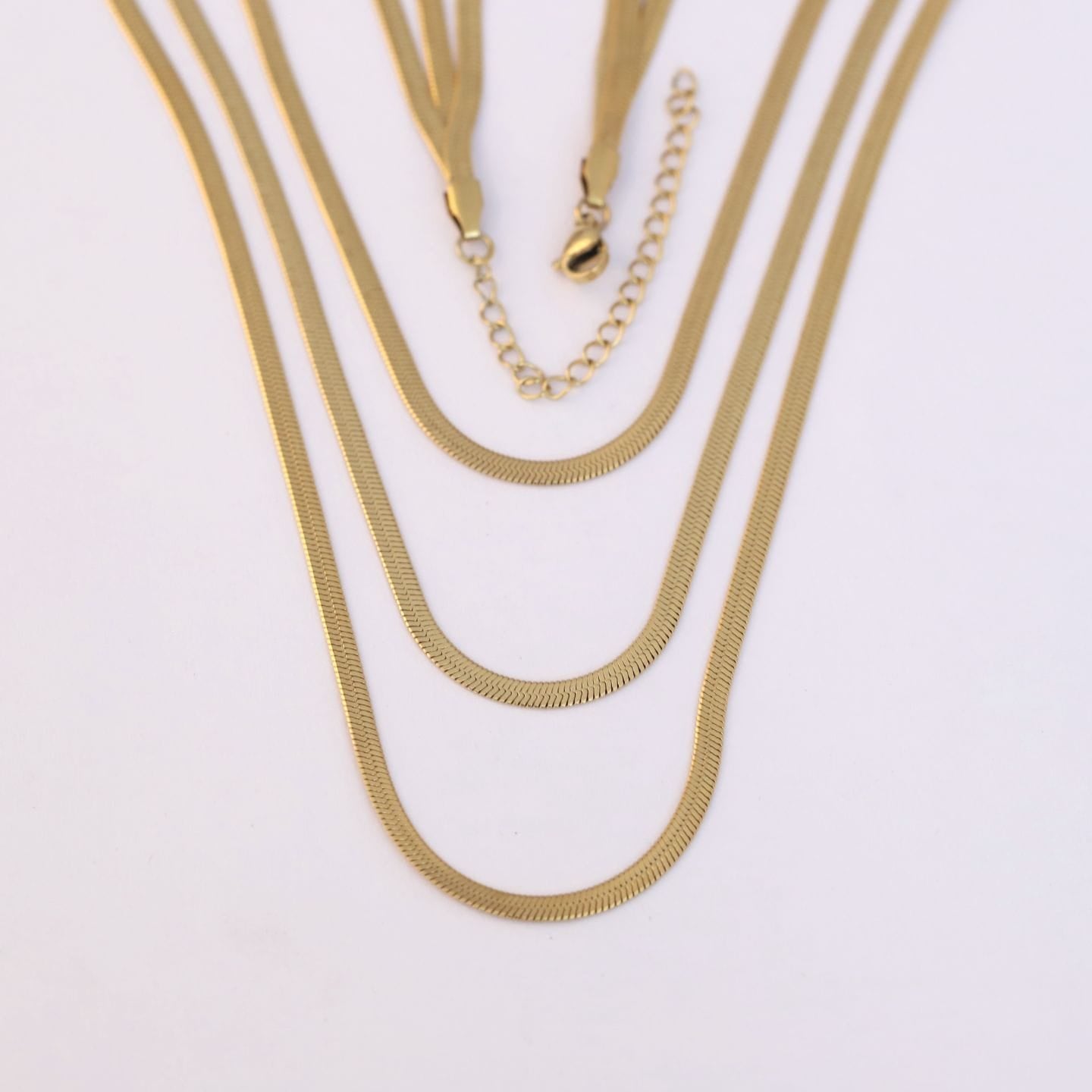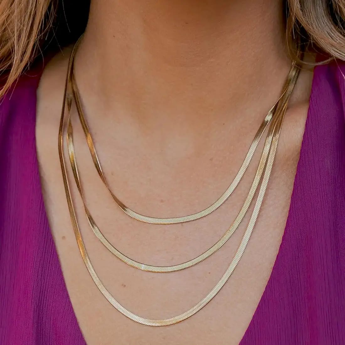 This necklace is a chic and sophisticated accessory designed for a modern, minimalist aesthetic. It features three separate chains of varying lengths, each with a sleek and fluid texture, creating a perfectly layered and luxurious look. Key Features: Triple-Layered Design: The set is composed of three individual necklaces, which are styled together to create a complete, voluminous look.