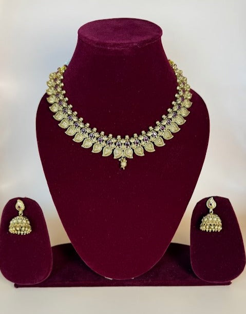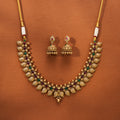 This is a stunning traditional Indian jewelry set, which includes a necklace and a pair of matching earrings. The design is inspired by temple jewelry and features an antique gold-toned finish.