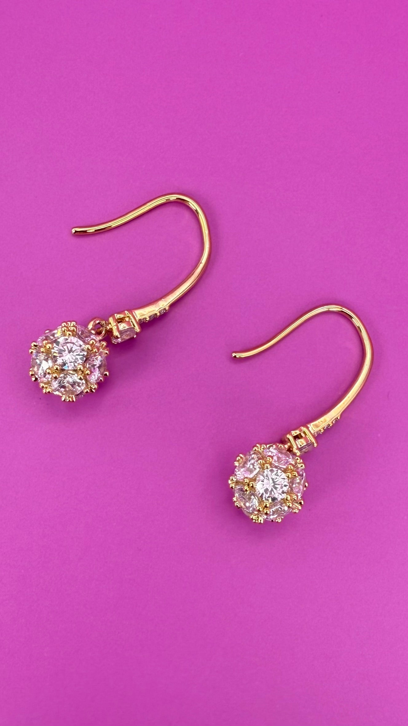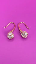 These stunning drop earrings feature a cluster of brilliant, circular-cut stones, likely cubic zirconia, creating a radiant, full-bodied sphere. The stones are expertly set in a warm, rose gold-tone metal, which forms the elegant hook-style backing. The design is both classic and eye-catching, with the cluster of stones catching the light to create a dazzling effect with every movement. These earrings are a sophisticated choice for special occasions, adding a touch of glamour and luxury to any evening wear or formal attire.